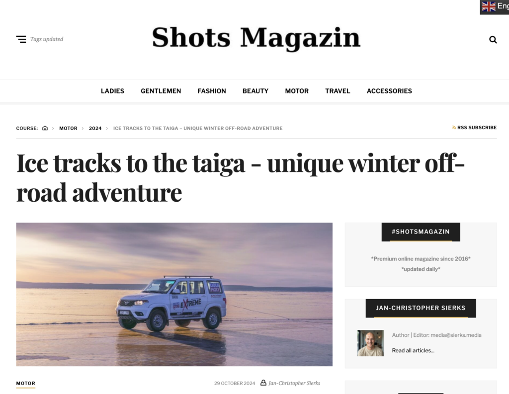 Business-Punk — Deutschlands führendes Magazin für unternehmerische Abenteuer — berichtete über die LIQUI MOLY Extreme Ice Tracks Expedition und erreichte damit ein Publikum von anspruchsvollen Abenteuer- und Erlebnissuchenden. Shots Magazin, die internationale Publikation für Kreativwirtschaft, berichtete ebenfalls über die „Ice Tracks to Taiga“-Tour und erweiterte damit die Sichtbarkeit von LIQUI MOLY Extreme auf Lifestyle- und Kreativmedienpublikum.